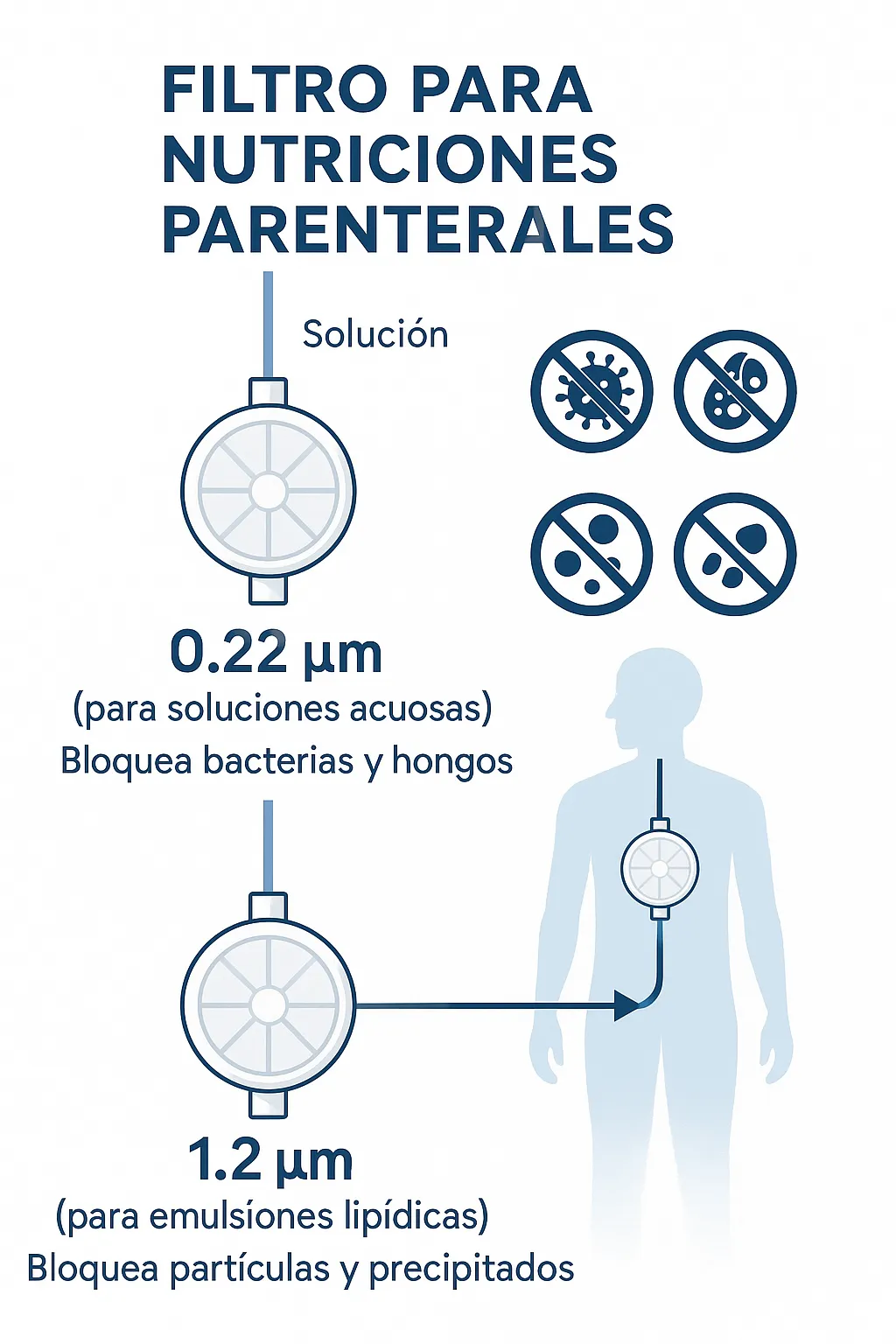Filtros de 1,2 μm: permiten el paso de emulsiones lipídicas, reteniendo partículas y precipitados peligrosos.