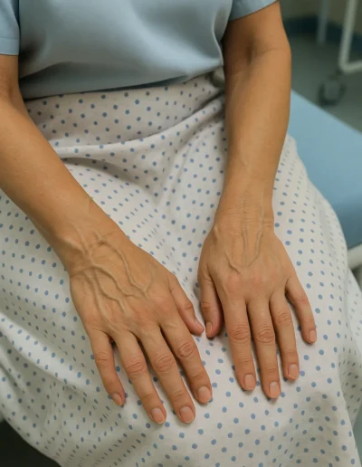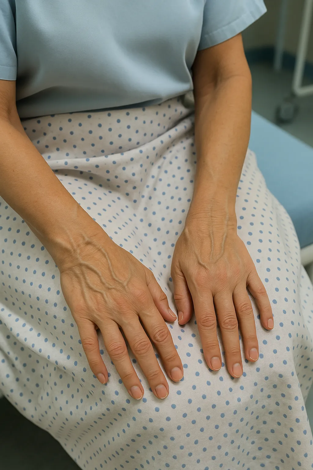 Acceso venoso: Venas superficiales visibles y palpables en dorso de ambas manos y antebrazos, fácilmente accesibles sin necesidad de torniquete.